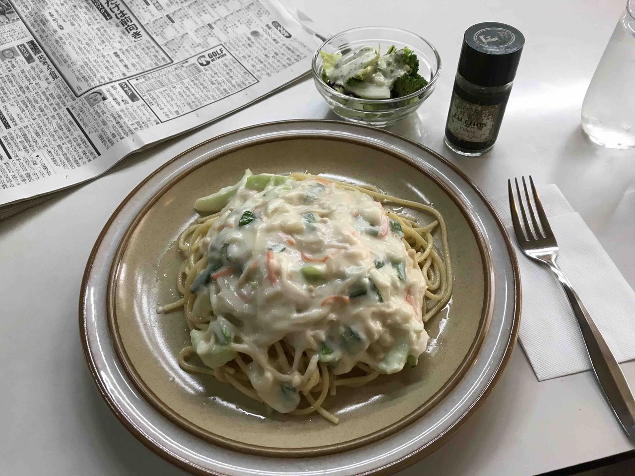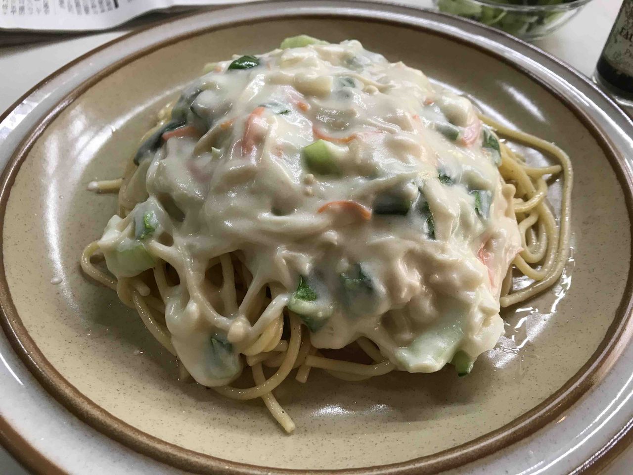 我が家はクリームシチューには必ずブロッコリーを別盛りで用意するんですが、ホワイトソースにブロッコリーはやっぱりあう。セロリなんかも入っていて好き嫌いが分かれるんじゃないかと余計な心配をしてしまいますが、喫煙男性もちょいと体に気を遣った気になる優しいスパゲッティーですね。