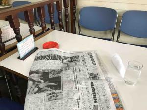 スポーツ新聞があり、各テーブルには灰皿がありまして。