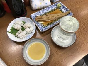 平目刺し、鯵の南蛮漬け、ピーマン炒め、ダツイモ、茹でイカ@魚源食堂
