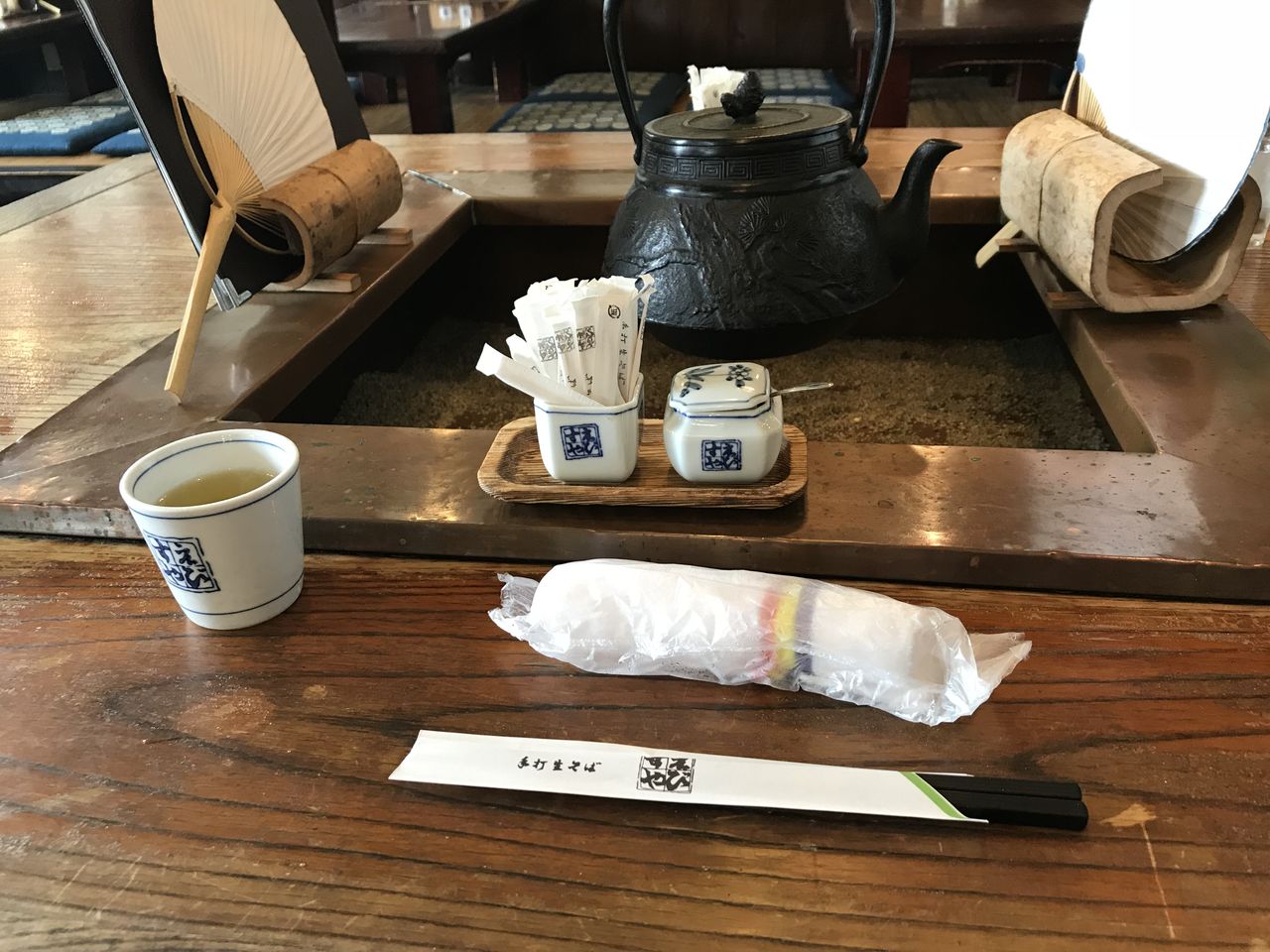 囲炉裏の前を陣取りましてえびすやグッズに囲まれる幸せ。