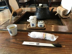 囲炉裏の前を陣取りましてえびすやグッズに囲まれる幸せ。