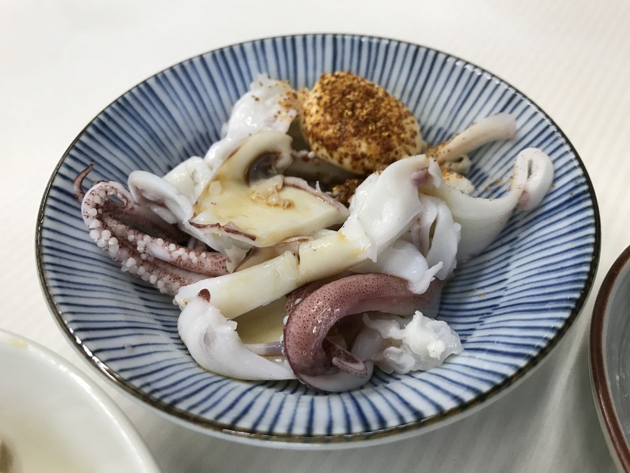 カツオ刺し、かりもり 、鱧(梅肉)、イカげそ、糸コン@魚源食堂