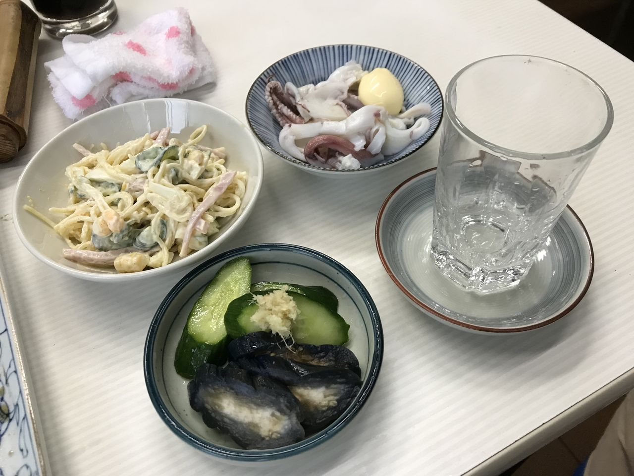 新さんま、カツオ刺し、スパサラ 、イカげそ、ナスきゅうり@魚源食堂