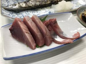 熱燗を待ちながらカウンターを眺めていると、魚源さんにしては珍しく刺身を並べ始めたので、それも頂戴することに。