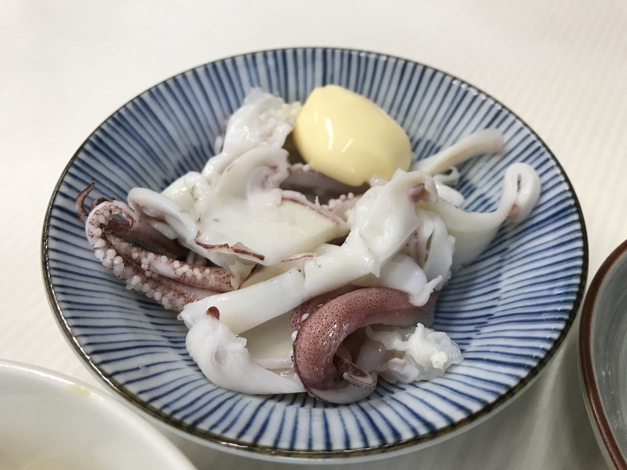 平目刺し、鯵の南蛮漬け、ピーマン炒め、ダツイモ、茹でイカ@魚源食堂