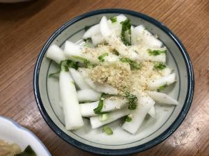 カツオ刺し、かりもり 、鱧(梅肉)、イカげそ、糸コン@魚源食堂