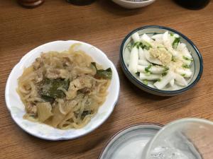 カワハギ煮付け、はんぺい煮付け、蝦蛄、明太子、胡瓜@魚源食堂