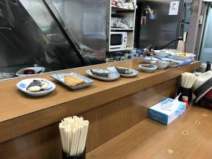 カツオ刺し、かりもり 、鱧(梅肉)、イカげそ、糸コン@魚源食堂