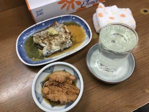 カワハギ煮付け、はんぺい煮付け、蝦蛄、明太子、胡瓜@魚源食堂