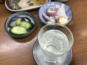 カツオ刺し、かりもり 、鱧(梅肉)、イカげそ、糸コン@魚源食堂