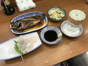 平目刺し、鯵の南蛮漬け、ピーマン炒め、ダツイモ、茹でイカ@魚源食堂