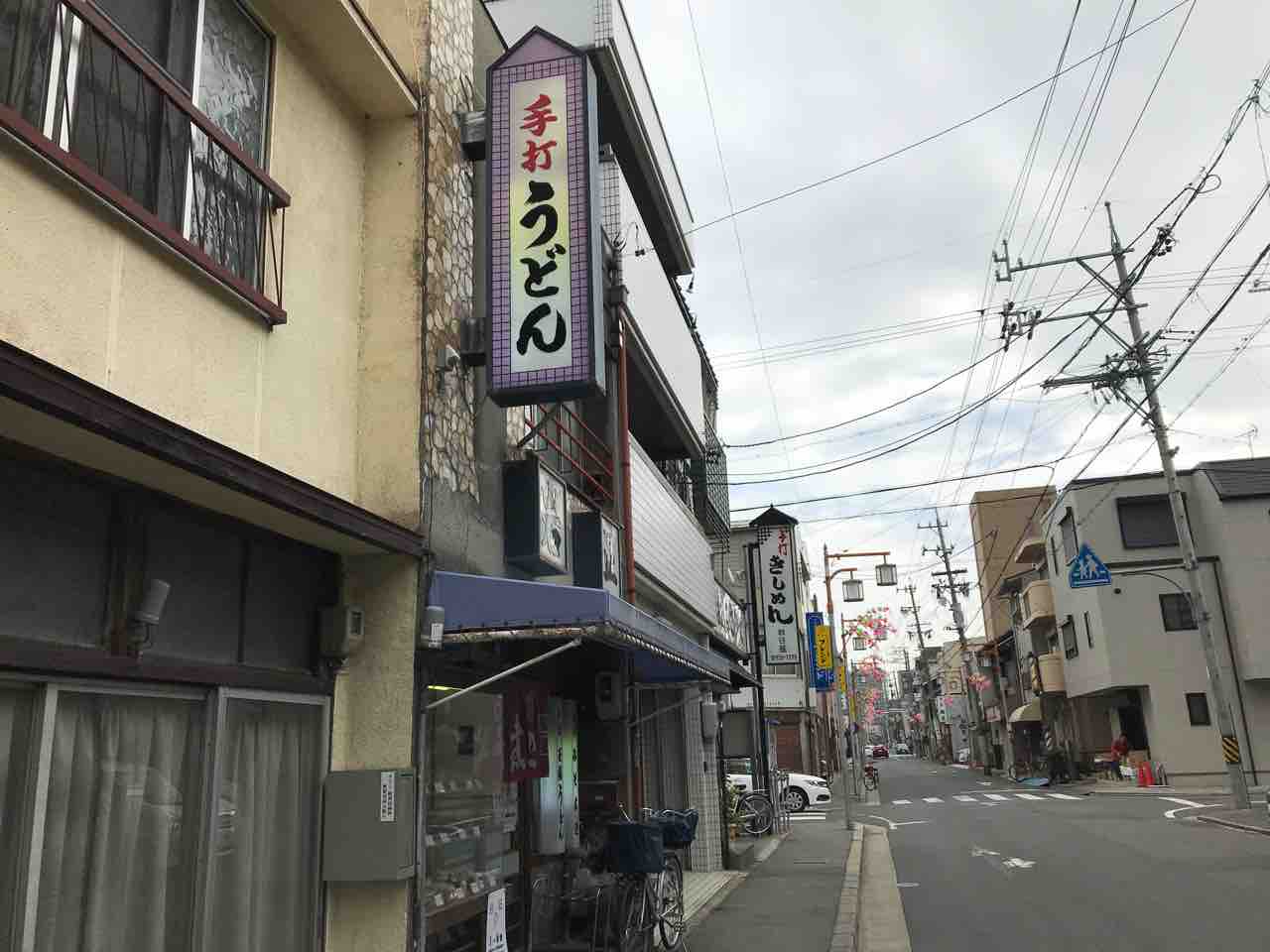 手打ちうどん、手打ちきしめんと看板が並ぶ筒井商店街。