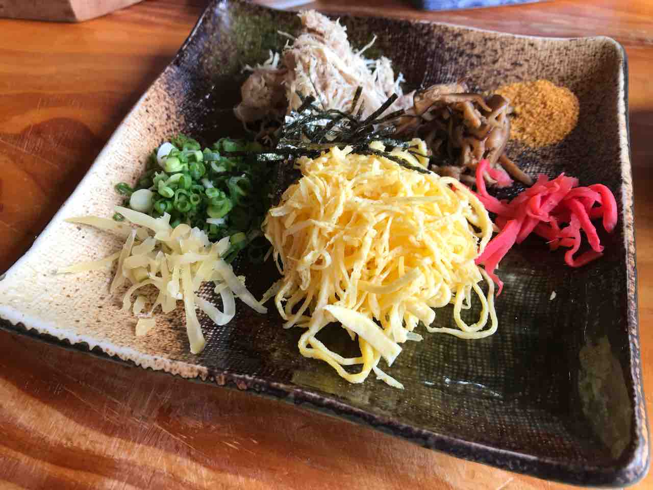 茶碗に盛った米飯に、ほぐした鶏肉、錦糸卵、椎茸、パパイヤ漬けか沢庵漬けなどの具材と葱、きざみ海苔、刻んだタンカンの皮(陳皮)、白胡麻などの薬味をのせ、丸鶏を煮て取ったスープをかけて食べる料理である。紅生姜を添える例もまれにある。米飯、具材、薬味、スープは別々の器で出され、自分で好きな配分で盛り付け、混ぜながら食べる。by Wikipedia