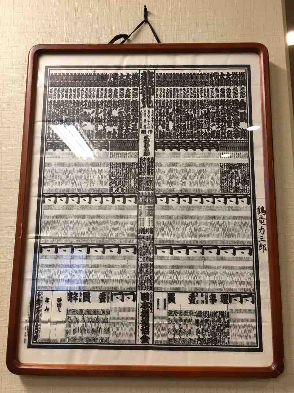 相撲部屋らしい番付表は井筒部屋横綱鶴竜から送られた物。