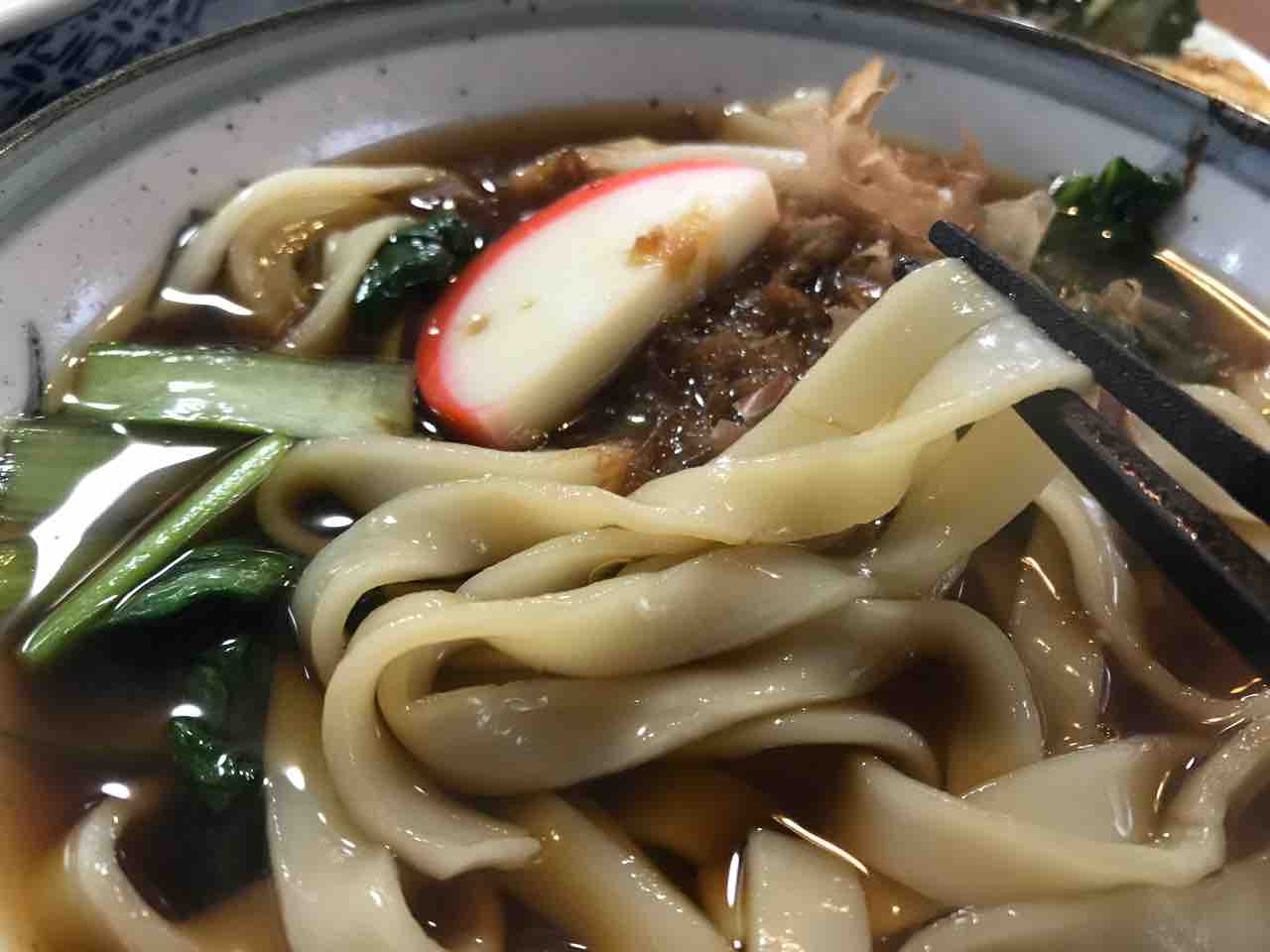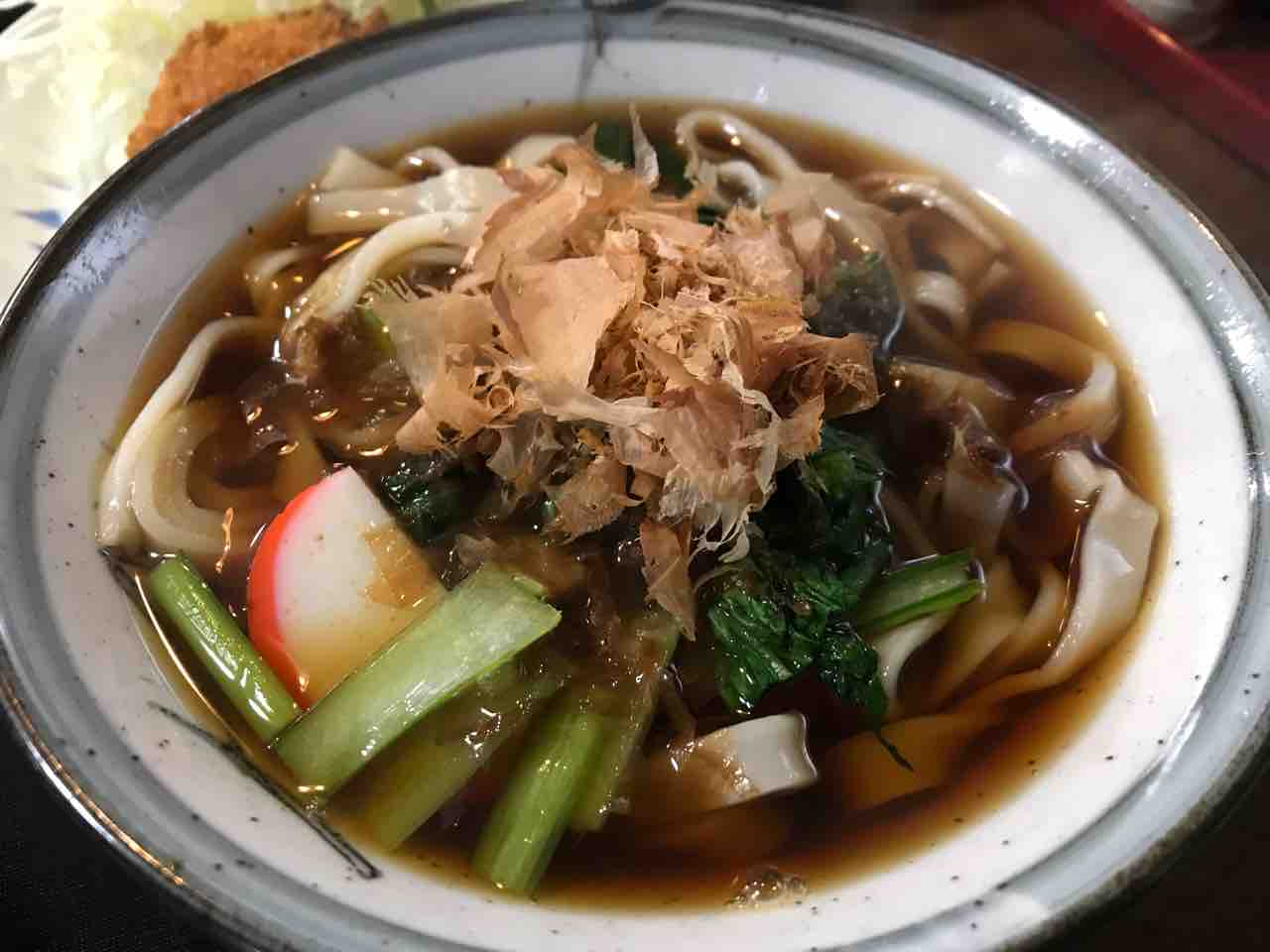 きしめんはかまぼこも青菜も花かつおもふんだんに入っております。