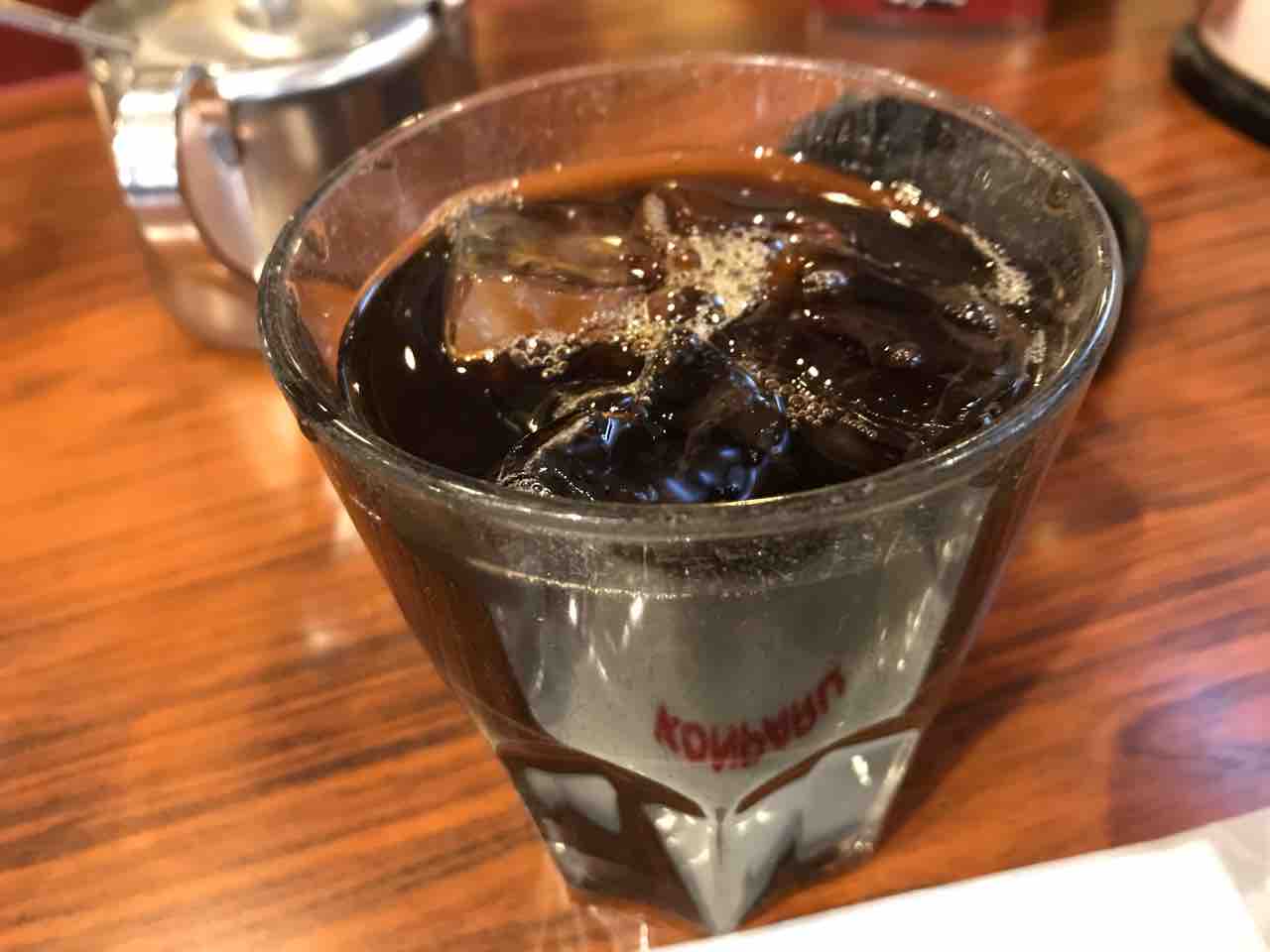 ネルドリップで沸かしたコーヒーに上白糖を入れよく混ぜる。そして同時に提供された氷の入ったグラスに注ぎ完成。