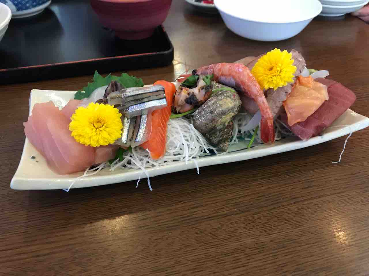 やっとこさお店に入れるとお刺身がお出迎え。