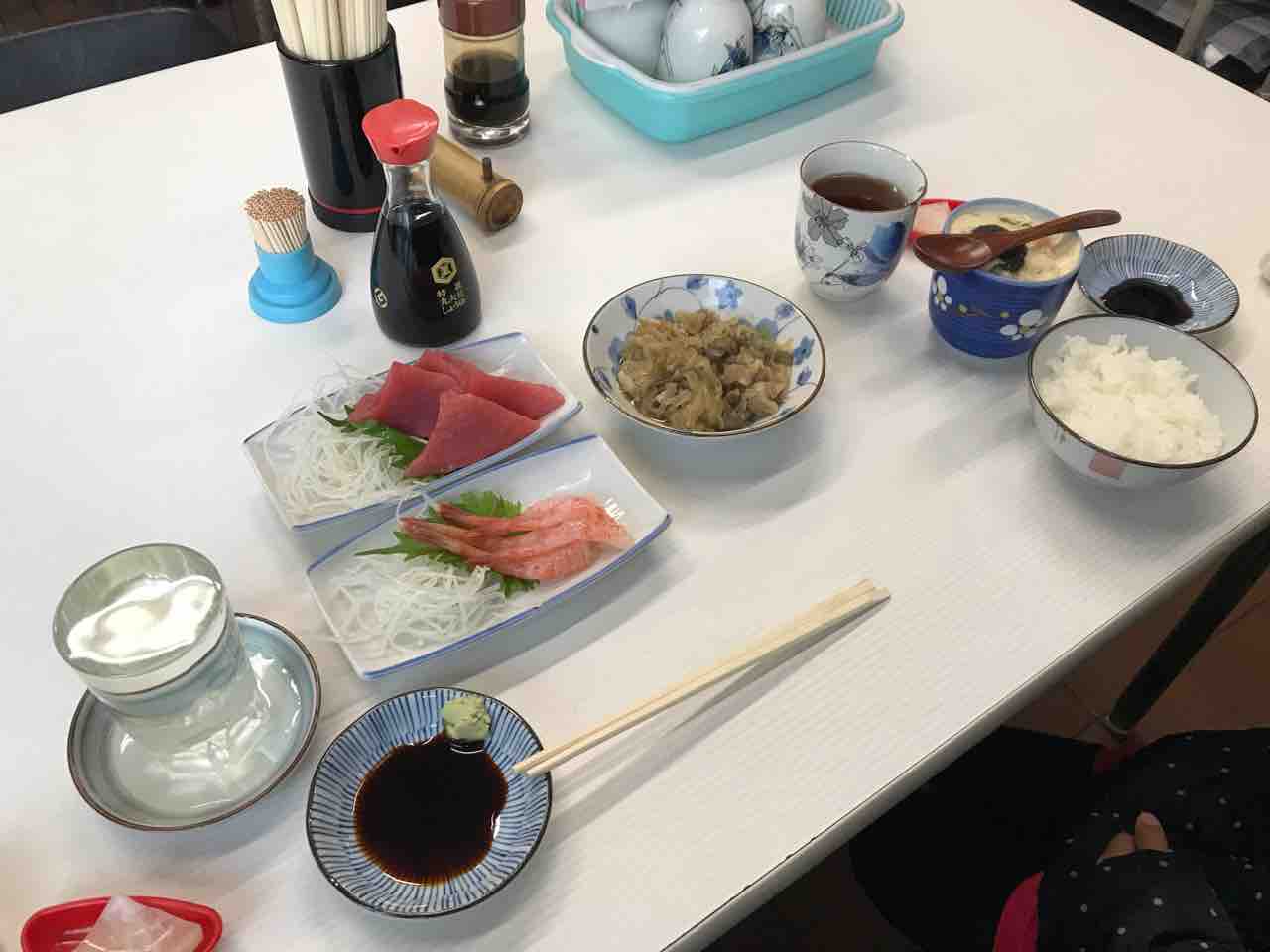 鮃刺、冬瓜、目玉焼き&ウインナー@魚源食堂