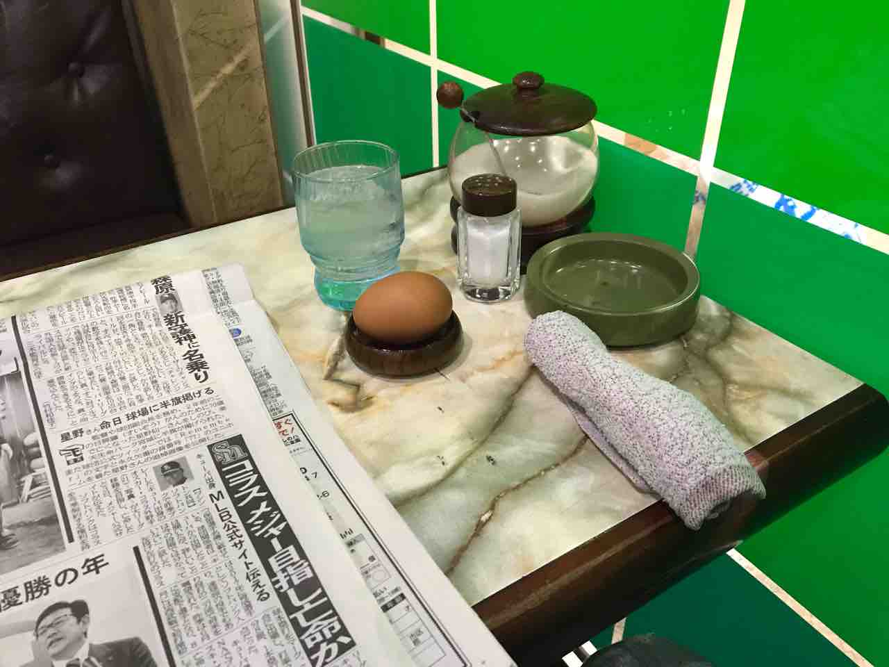 スポーツ新聞をラックから取り出し着席すれば水にゆで卵。