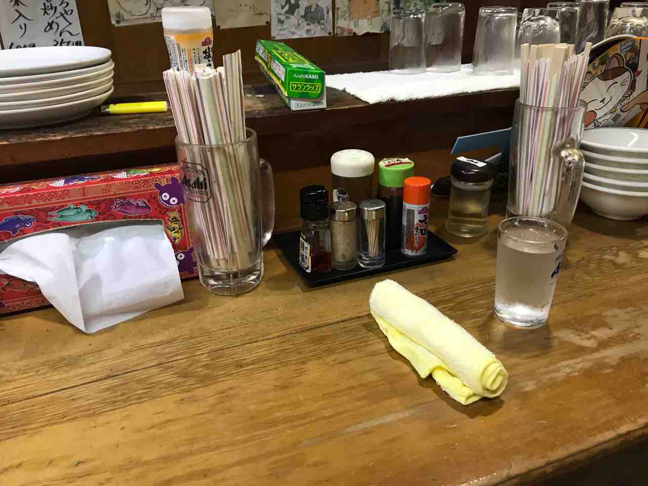 入店すると居酒屋みたいな雰囲気だが、年季の入ったカウンターには基本調味料がたくさん。