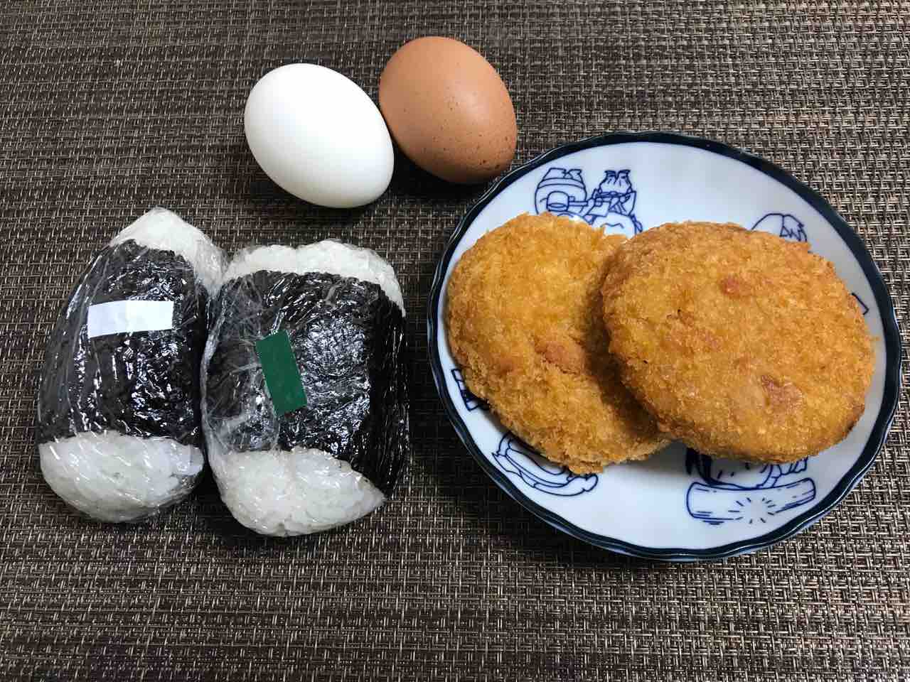 おにぎり、いなり寿司、卵サンド、コロッケ、烏賊の香草揚げ202003