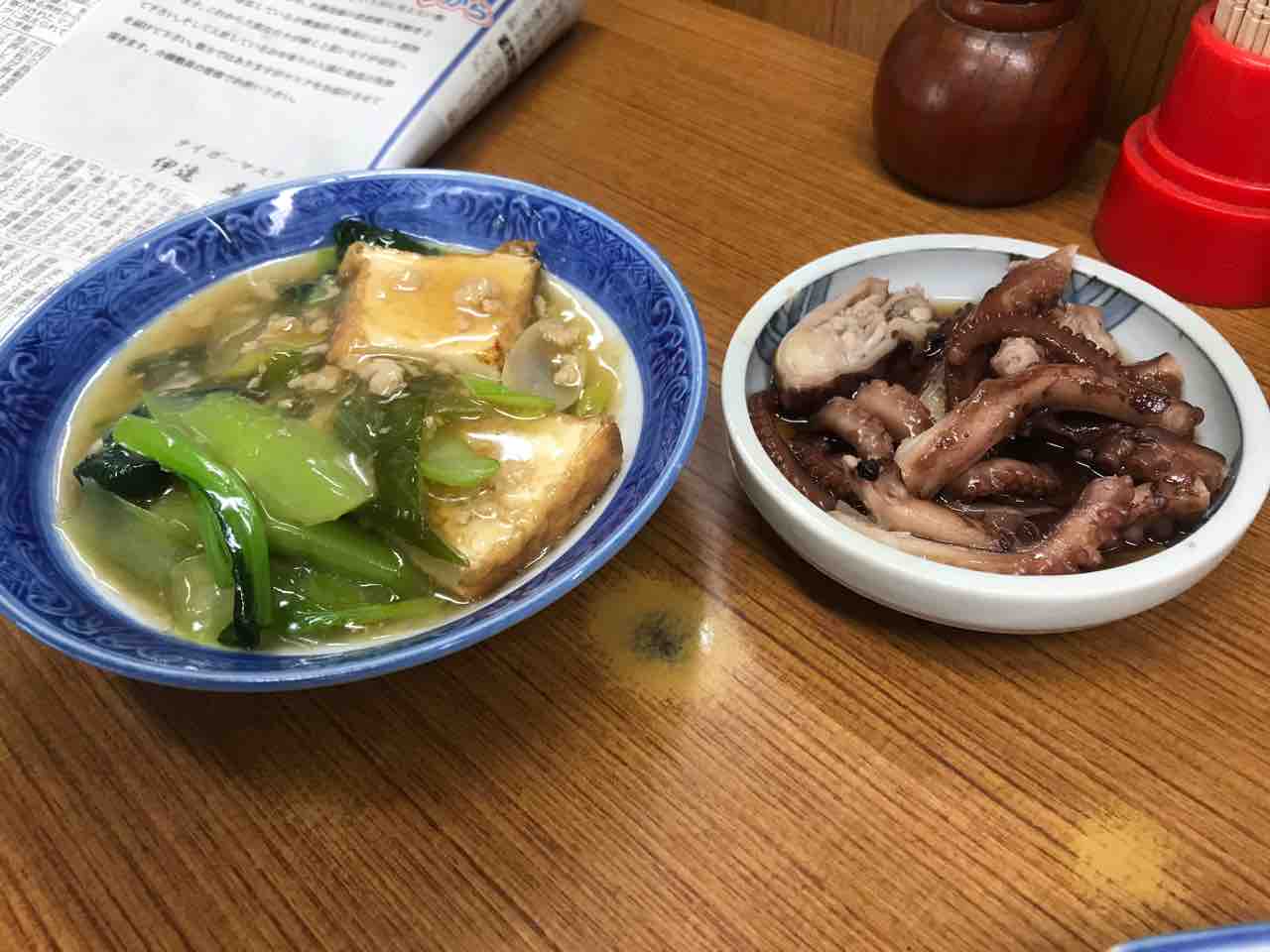 市場で鮪刺、厚揚げ煮、手長蛸、サバの塩焼き、手長蛸@魚源食堂(柳橋中央市場、愛知県名古屋市中村区名駅)