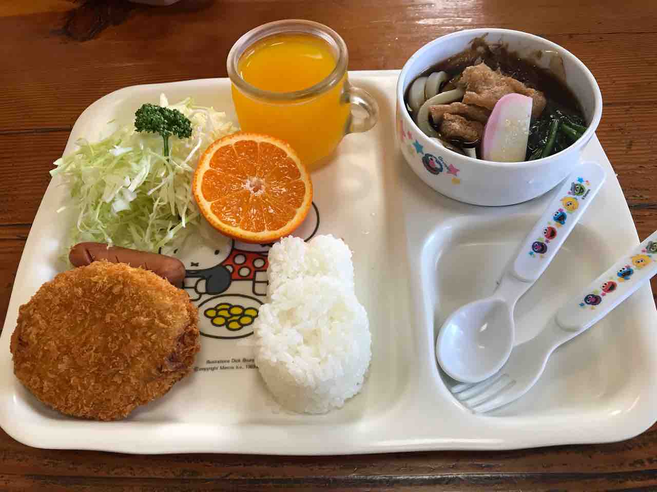 よい子定食(うどん)はご飯もミッフィーちゃんにしてある手の込んだもの。