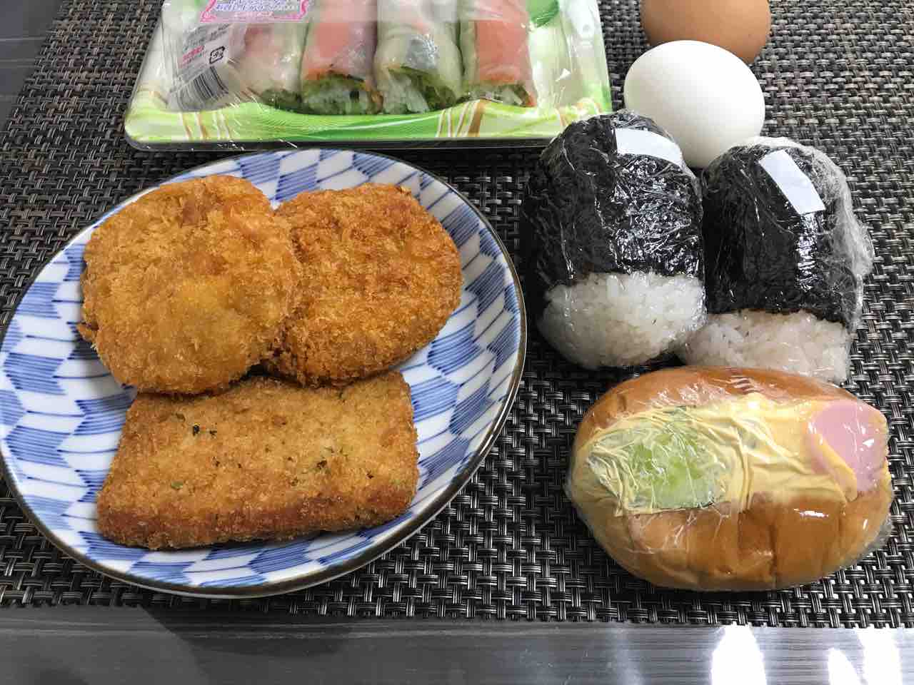 おにぎり、いなり寿司、卵サンド、コロッケ、烏賊の香草揚げ202003