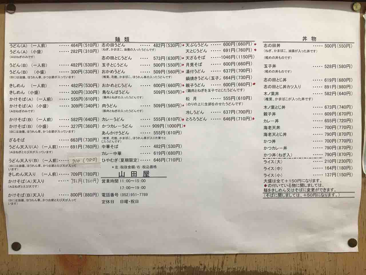 うどん、志の田丼、きしめん(小)、中華そば@山田屋201405