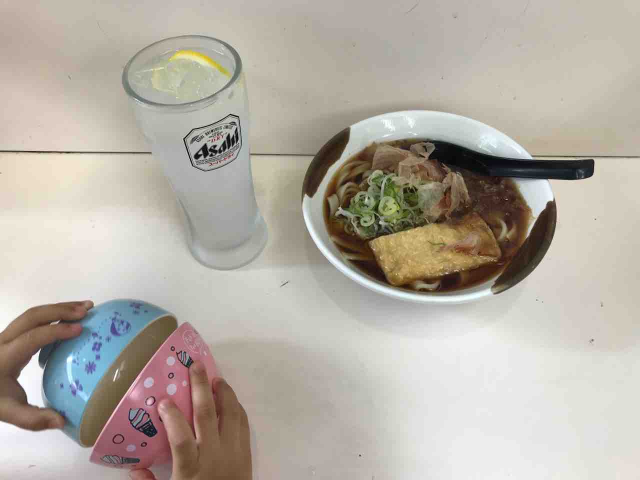 お子様の意見に逆らえず温かい「きしめん」とお父さんの意見を通したチューハイ。