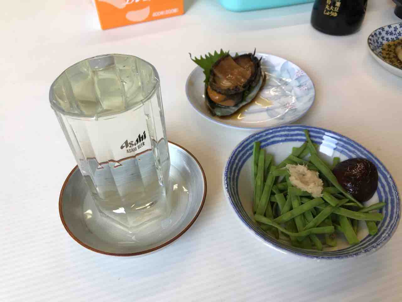 穴子刺、鱧湯引き、アスパラ、椎茸、焼きそば、厚揚げとほうれん草の豆板醤炊@魚源食堂