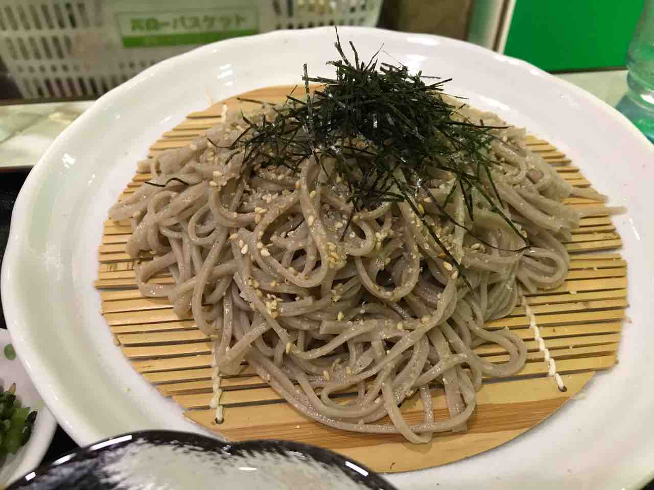 ざるそばにゴマと刻み海苔がふんだんにかけてあります。