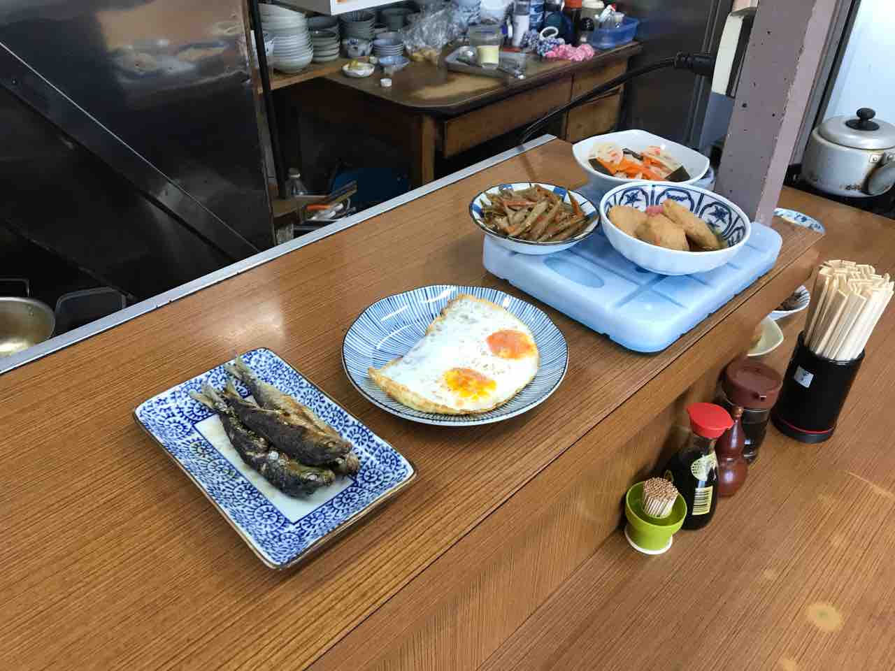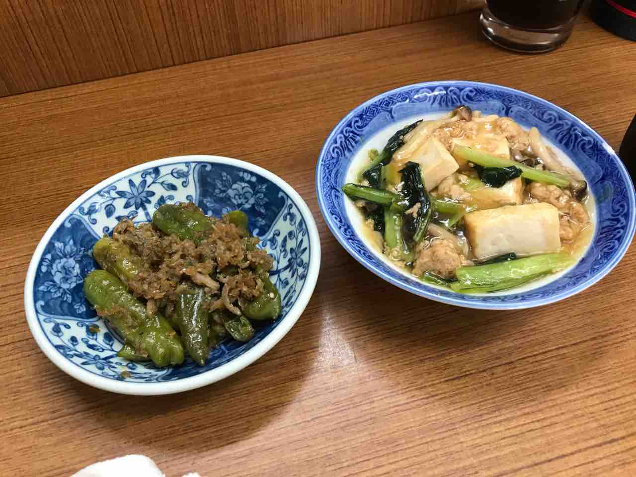たこぶつ、揚げ出し豆腐、カマス一夜干し、ピーマン@魚源食堂