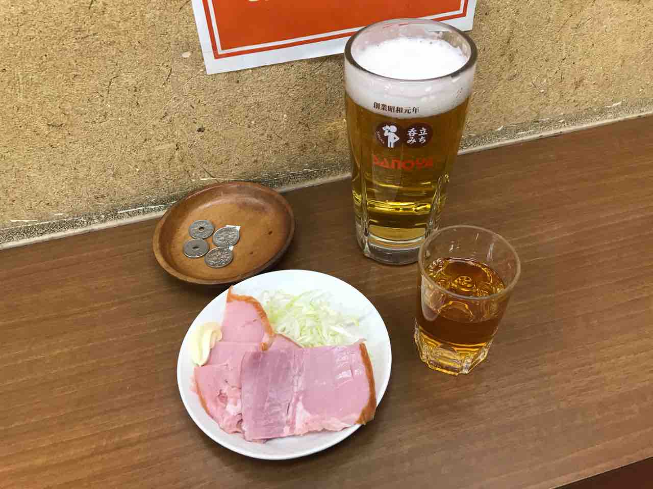 相思相愛の電気ブランと生ビールにショルダーハムをつけて15分でお店を出ます。