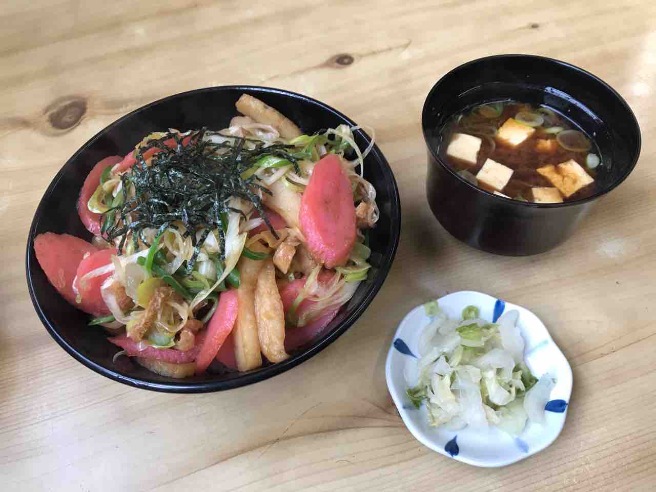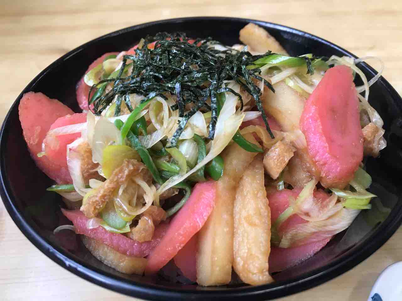 油揚げ、長葱にさつま揚げ(名古屋では「はんぺい」と呼ぶ)が入っているんですが、そのはんぺいの中でも名古屋独特の赤棒が入っておりますな。