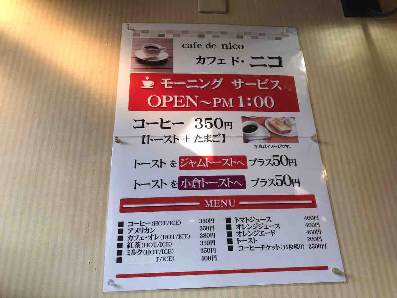 カフェド・ニコ@愛知県名古屋市熱田区千代田町愛知市場これが名古屋のモーニング。大名古屋食品卸売センターの前にあるカフェド・ニコさんでモーニング。TwitterFacebookはてブPocketLINEコピー 2021.02.21本日は愛知県名古屋市熱田区千代田町にあるカフェド・ニコさんにお邪魔しました。大名古屋食品卸売センターの駐車場側向かいにあるカフェド・ニコさん。警備員さんの憩いの場ですな。市場の喫茶店ですが、健康増進法の為禁煙になっていますな。名古屋の喫茶店と言ったらモーニング。ホットコーヒーをお願いしただけですが、パンと卵がついてきます。毎日飲むことを想定していると思われる優しい珈琲。トーストは塩を振って料理っぽくしていただきます。ゆで卵は子供のお土産ってのが我が家の定番。ご馳走様でした。名古屋のモーニングって説明しずらいんですが、こんな感じです。コーヒーを頼むとトーストにゆで卵くらいついてくるサービスの総称がモーニングでして、たまに24時間モーニングなんてお店もあります。こちらのお店は13時までモーニングをやっているそうです。cafe de nico愛知県名古屋市熱田区千代田町13営業:7:00~14:30定休:水共有:Facebook で共有 (新しいウィンドウで開きます)FacebookX で共有 (新しいウィンドウで開きます)Xいいね:いいね 読み込み中…関連市場でフラれる…@フジサワ中華そば(大名古屋食品卸売センター、愛知県熱田区日比野)晴快荘名古屋本店202102@愛知県名古屋市中区栄ホーム愛知市場プロフィール(このブログを書いている人)プライバシーポリシー&免責事項お問い合わせフォーム%dタイトルとURLをコピーしました