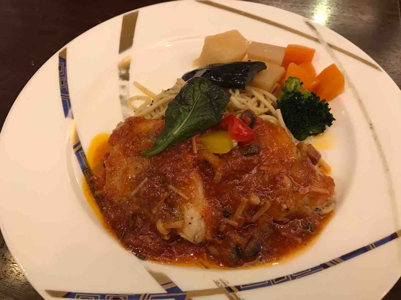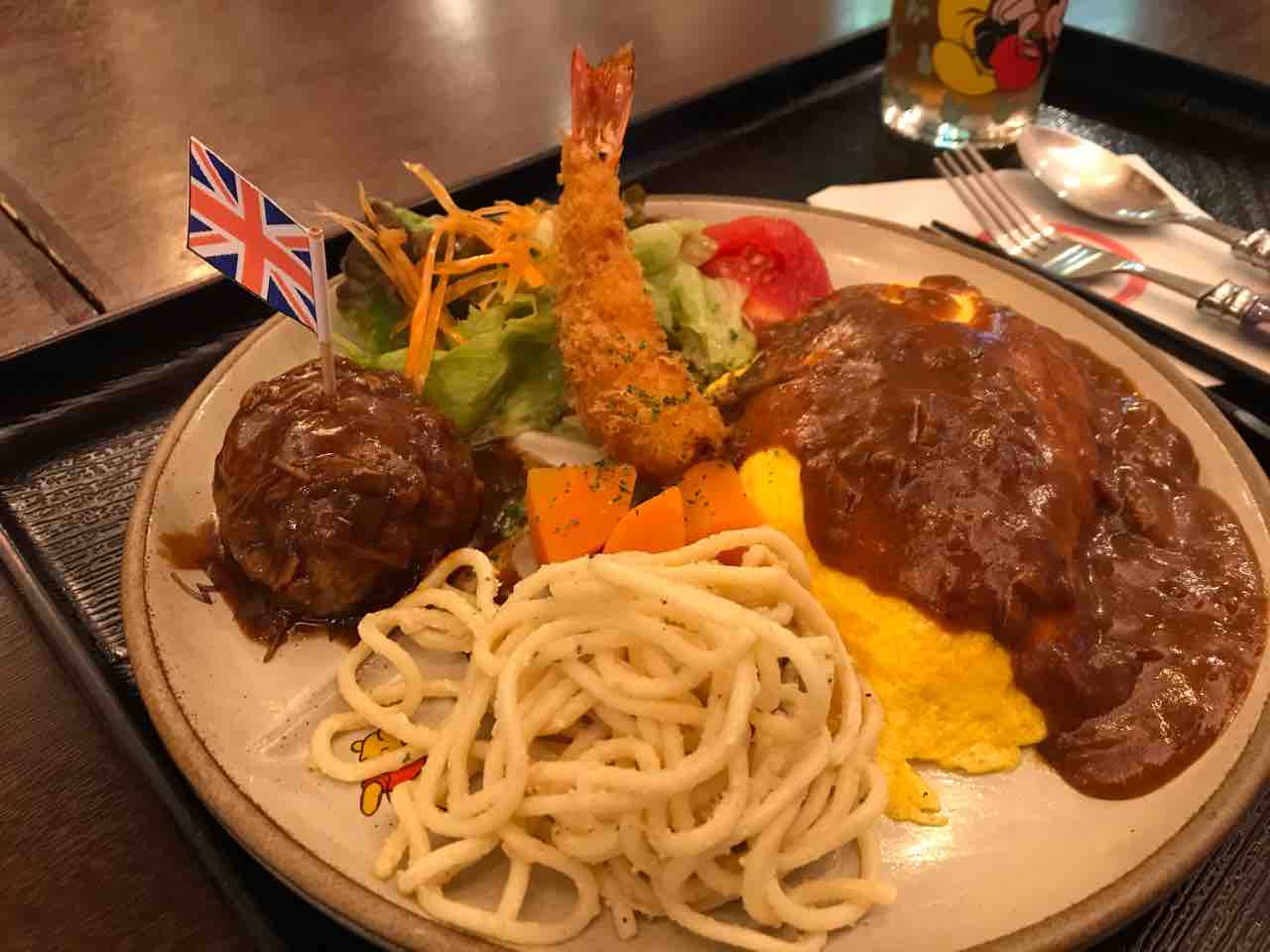 ハンバーグは香辛料が香るし、エビフライはプリップリ、付け合わせのニンジンはグラッセだし、パスタも旨い。