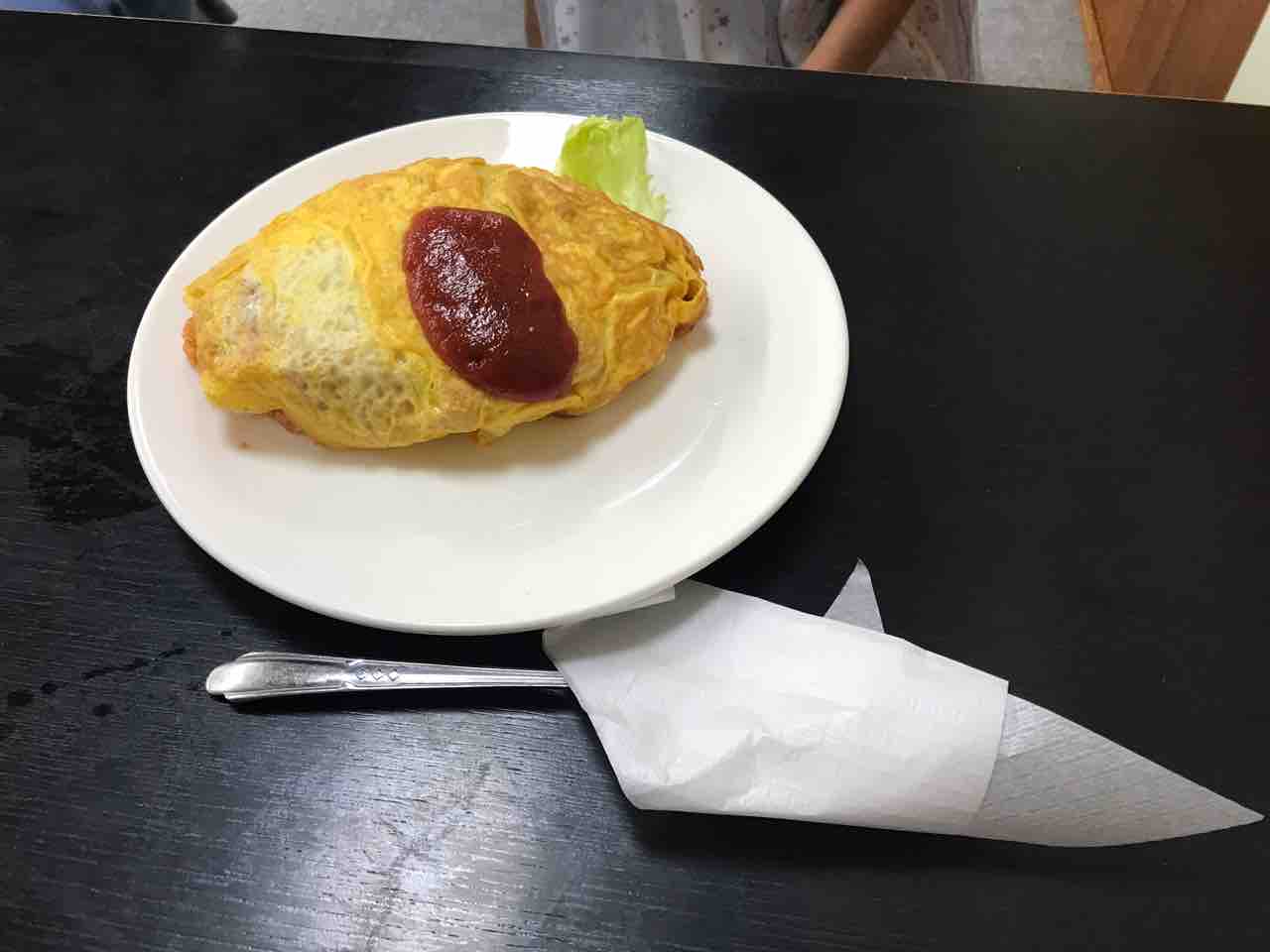 薄くしっかり焼かれた卵に包まれたチキンライス。結構なボリュームですが、子供がパクパクと食べました。