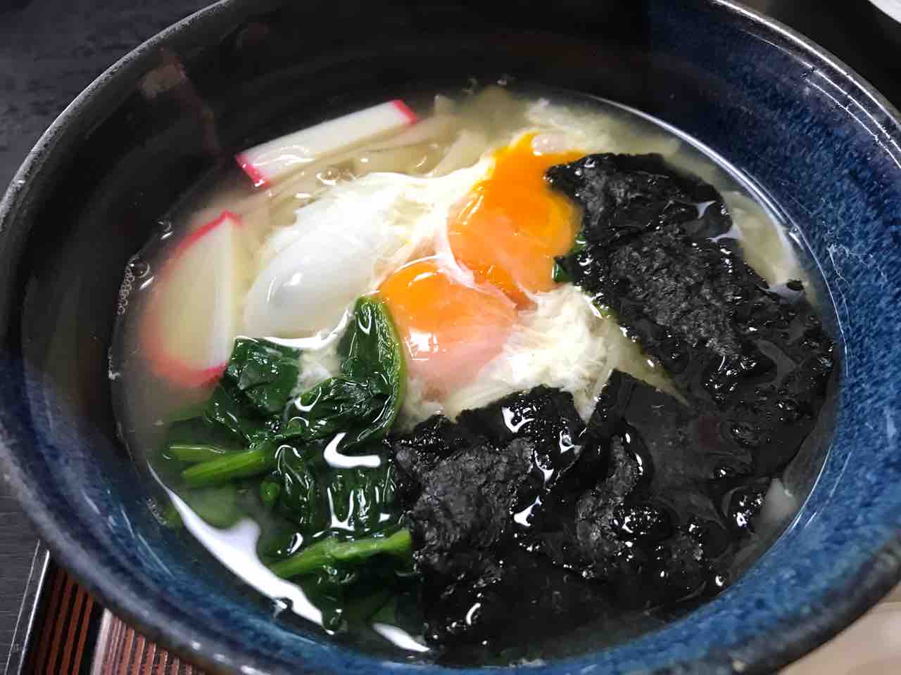 汁は白汁。板海苔の上に卵を落としたもの。卵は白身が少し白くなる程度加熱、もしくは熱い出汁をかけ朧月夜って感じにするのが好ましい。