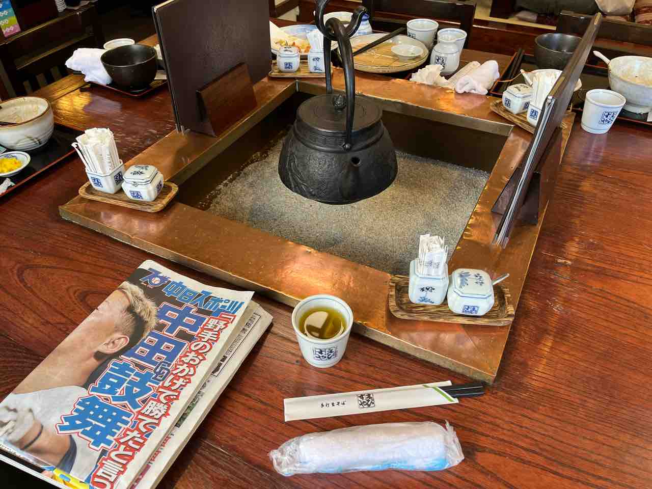 ちょうどひと波終わったタイミングだったらしく、囲炉裏をグルッと囲むカウンターにスポーツ新聞を奪ってから陣取ります。