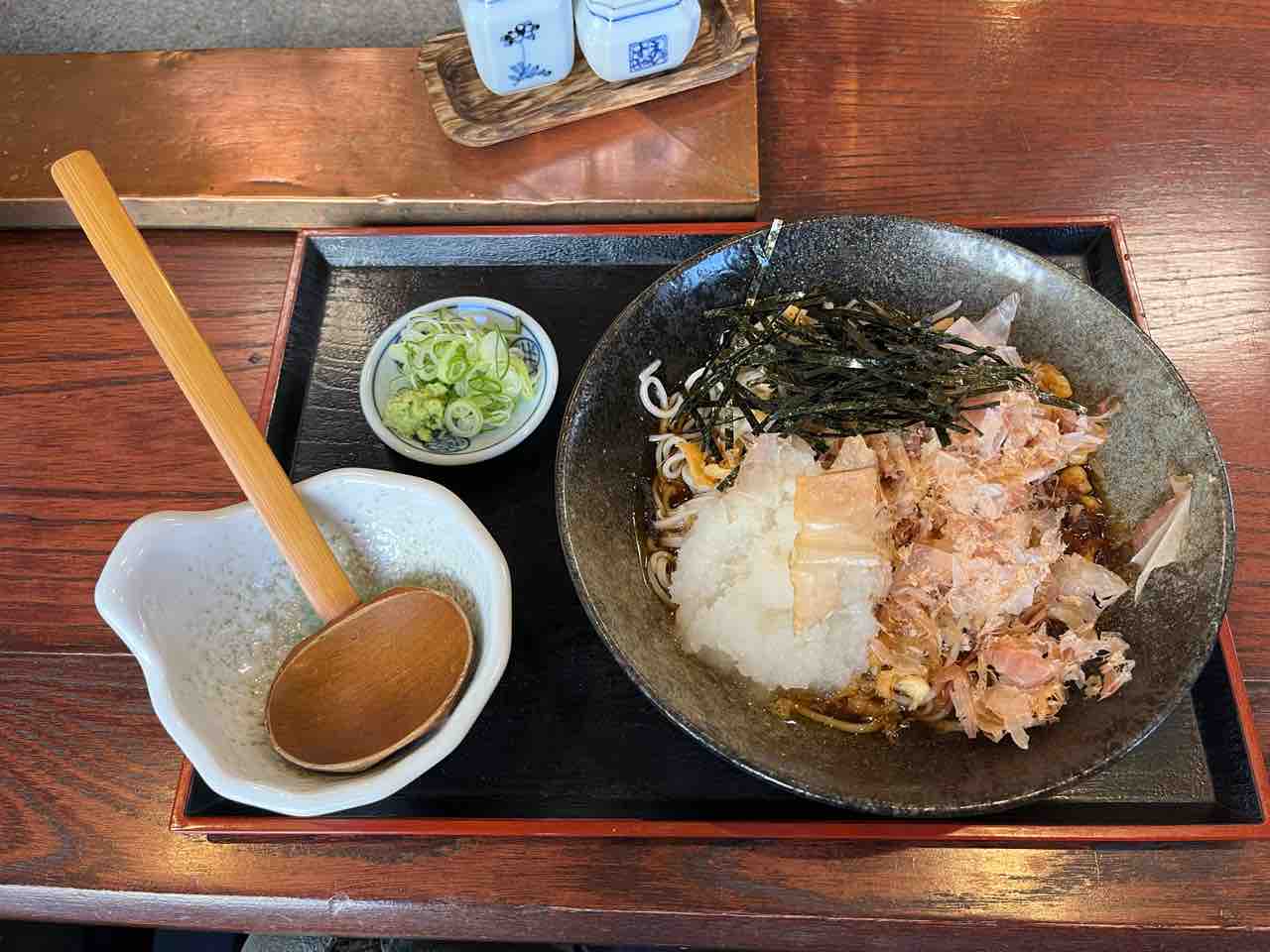 揚げ玉に大根おろし、刻みネギに海苔、花かつおどっさり。