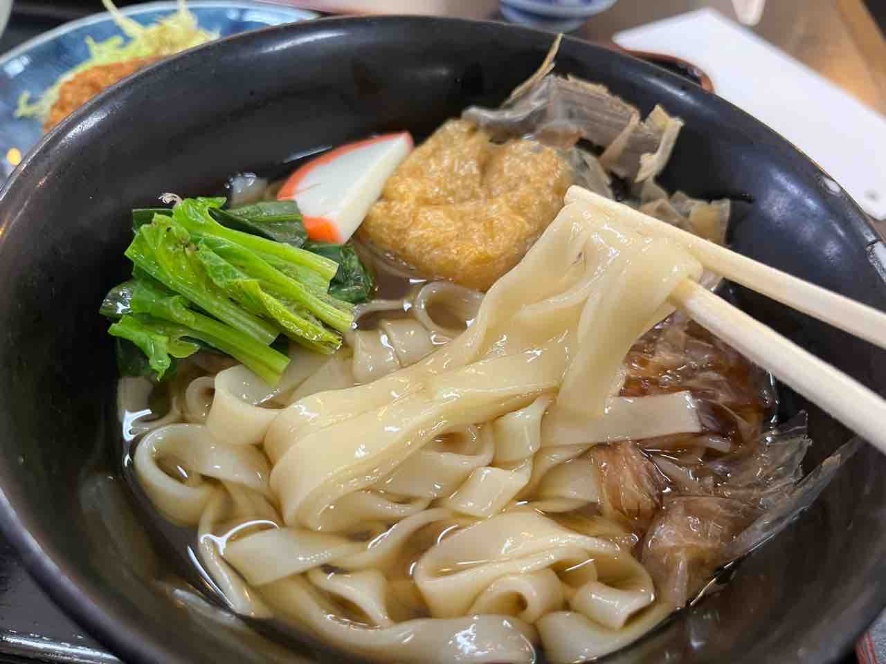 きしめんは油揚げ、かまぼこ、青菜って三種の神器に花かつおがどさっとかかった伝統的なビジュアル。