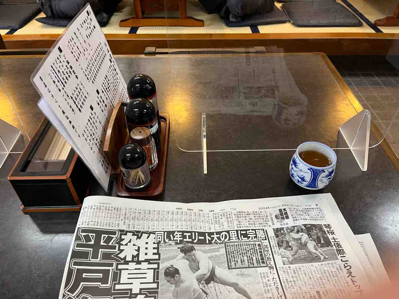 スポーツ新聞を確保し、相席の大きいテーブルに鎮座いたします。