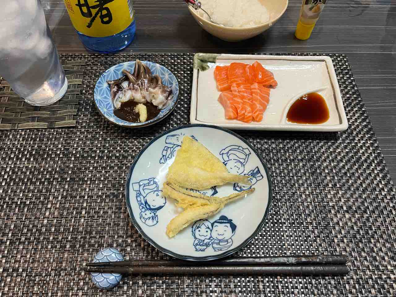 この日の夕餉は天ぷらに鳥貝&タスマニアサーモン。