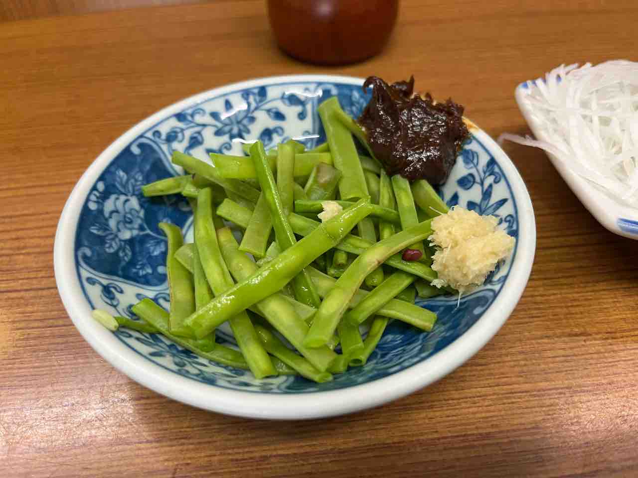 十六ささげに赤味噌の酢味噌に生姜のマジックをかけていただきます。