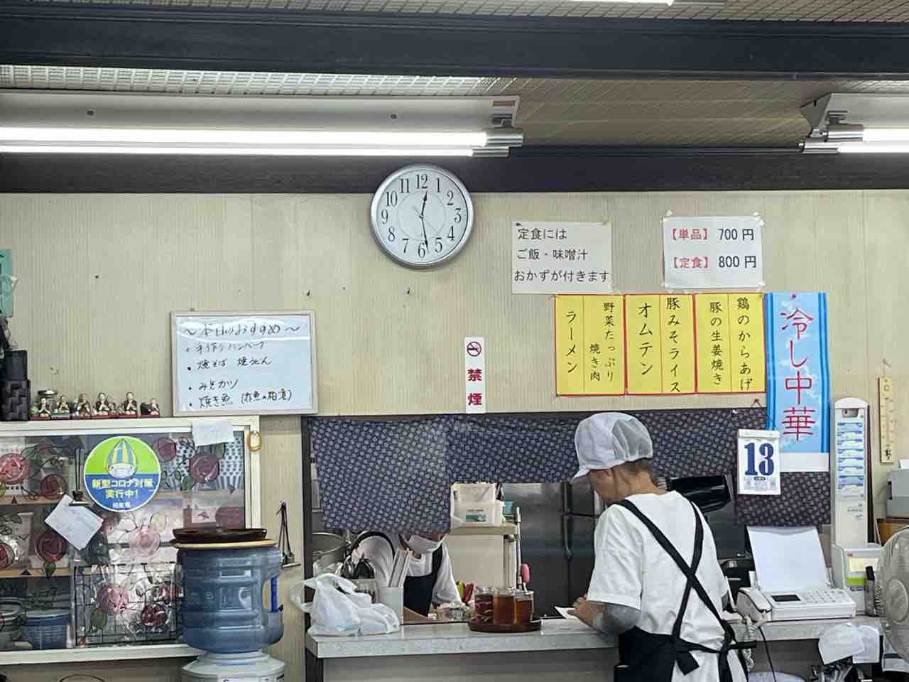 市場で豚生姜焼き定食、ラーメン、オムテン@寿食堂20240323