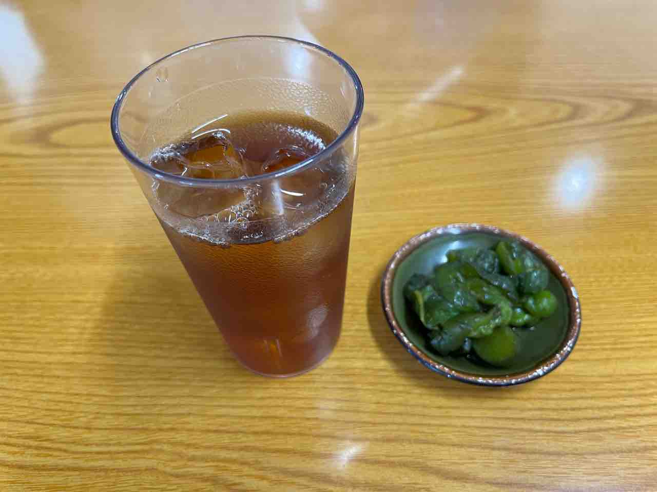 テーブルで注文を済ませ、テイクフリーのウーロン茶と漬物でのどを潤します。