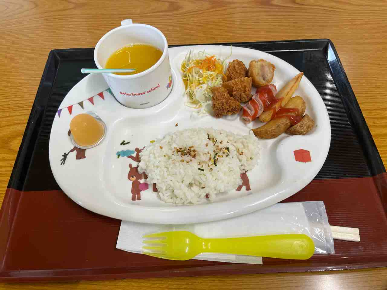 唐揚げに赤いウインナーフライドポテト。ご飯にふりかけ。オレンジジュースにゼリーがついた実にお子様ランチらしいワンプレート。