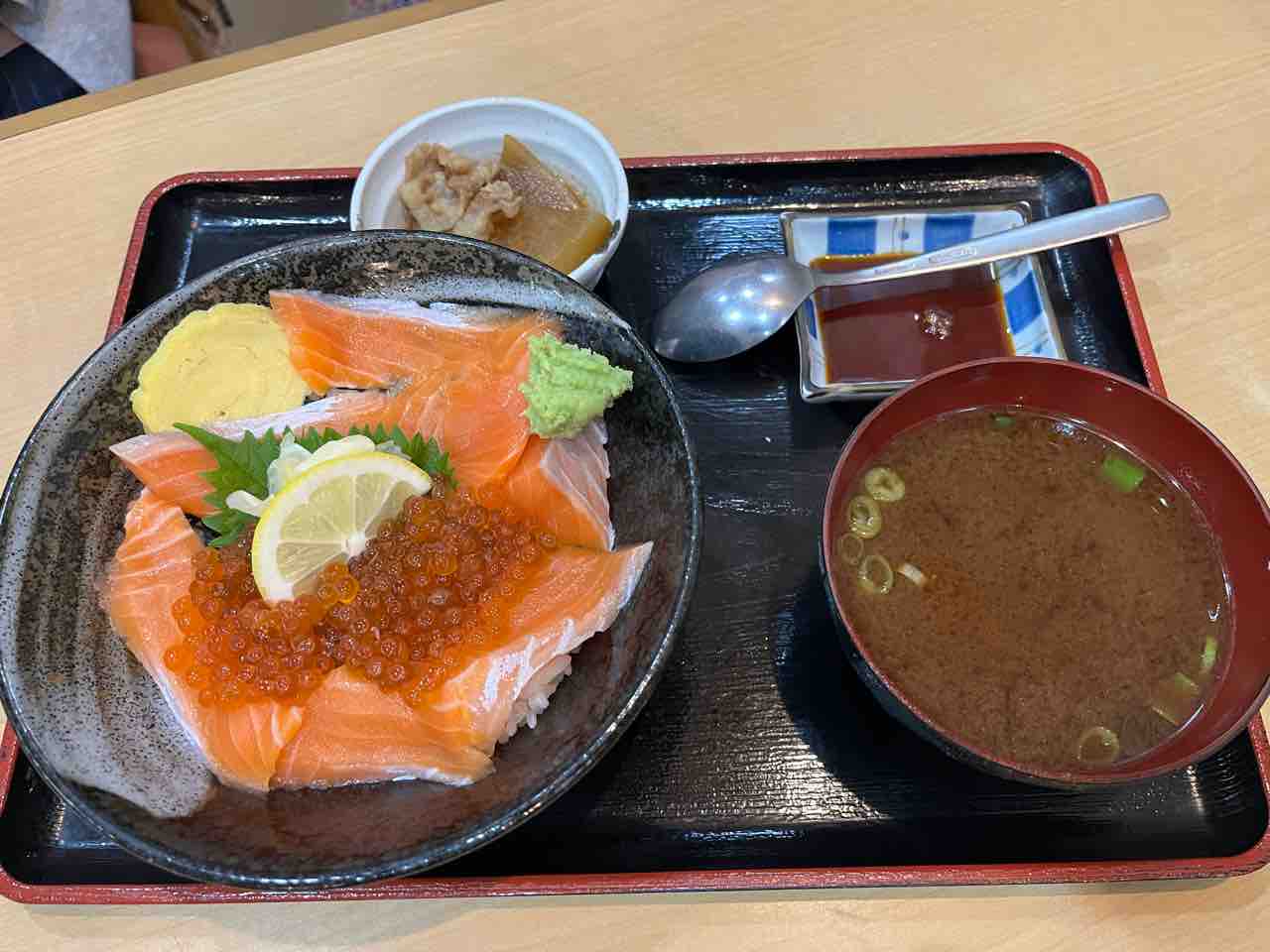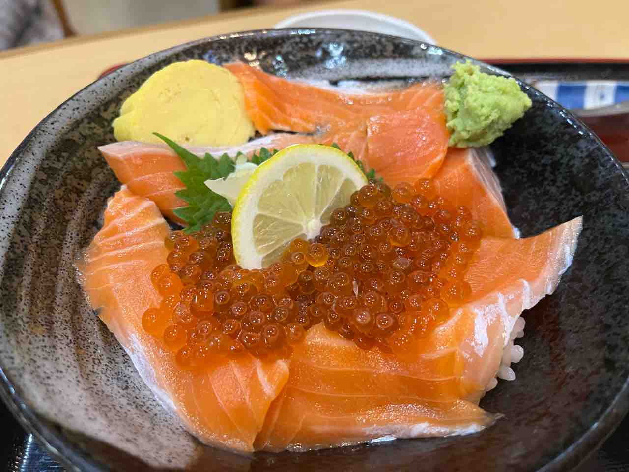 大姉ちゃんがサーモンとイクラ丼。定食にしてご飯少なめにしていただいております。