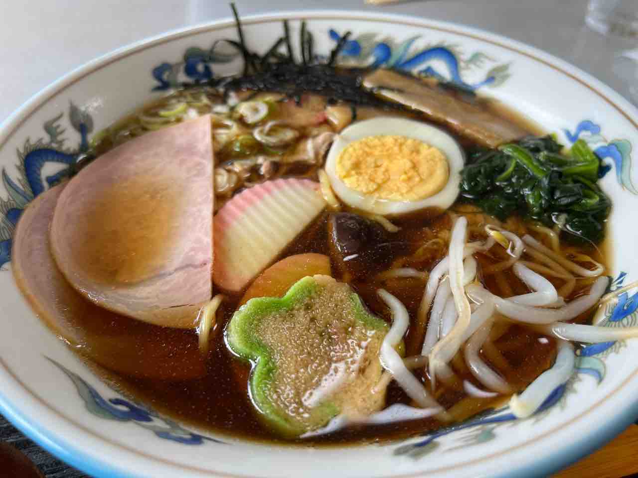 こちらの中華そばの具はハム、かまぼこ、花麩にシナチク、もやしに刻み葱、干しシイタケなんですが、五目中華はハムにかまぼこが2枚になり、ゆで卵にほうれん草、刻みネギが追加された豪華絢爛なものになるんですなぁ。